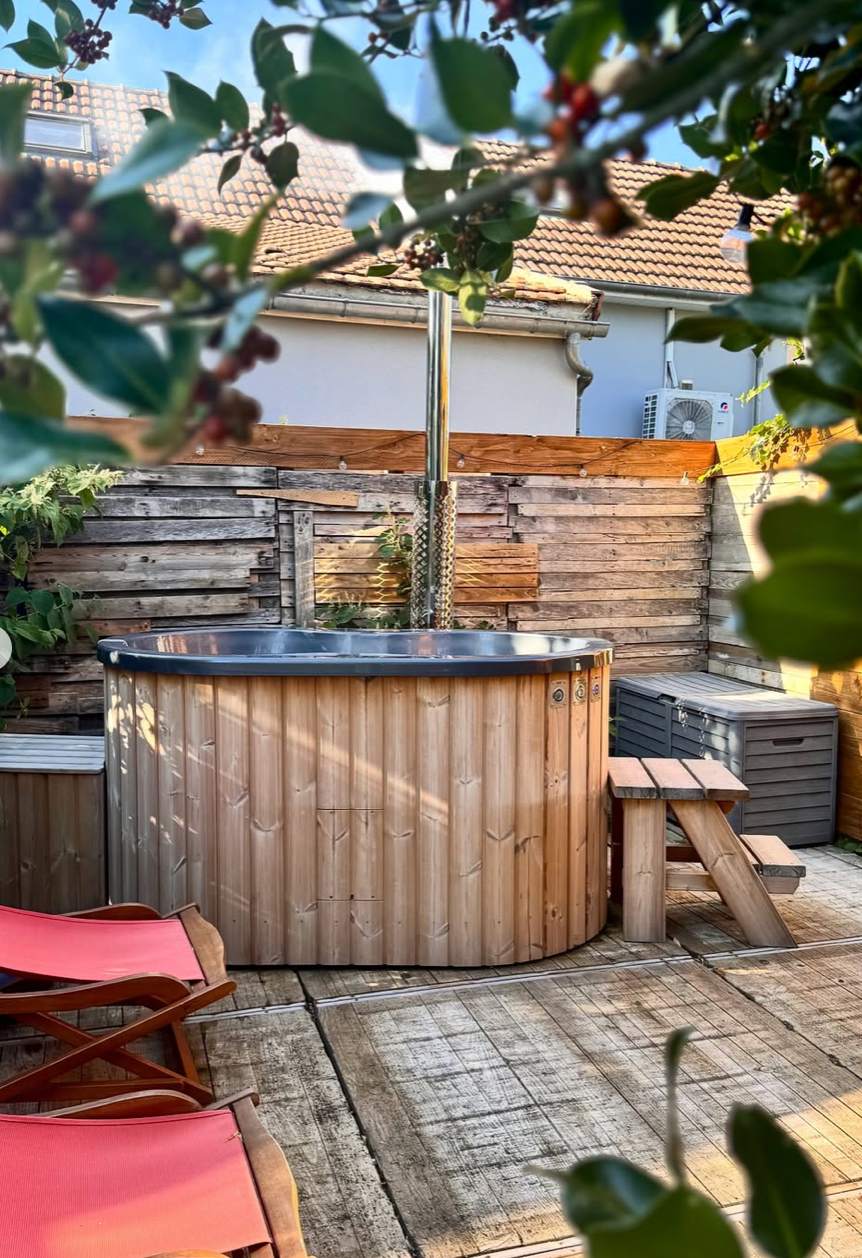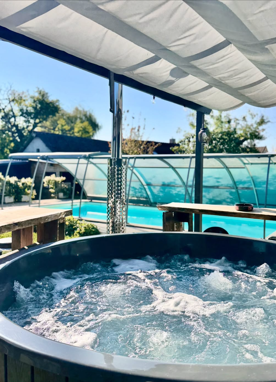 Le gîte dispose d’un bain nordique/jacuzzi de 10 à 14 places avec 2 bars et chaises hautes, ainsi qu’une piscine chauffée et éclairée, partiellement découvrable, accessible de mi-mars à mi-octobre selon la météo. Vous profiterez également d’une grande plage de piscine avec canapés et bains de soleil en bois de palette, d’un barbecue au charbon de bois, de deux espaces pique-nique (au soleil et à l’ombre d’un pommier), d’un banc de repos, d’un parking privé sécurisé pour 4 à 5 voitures, et d’une aire de jeux sécurisée pour les enfants. Plusieurs activités sont disponibles à proximité pour compléter votre séjour.