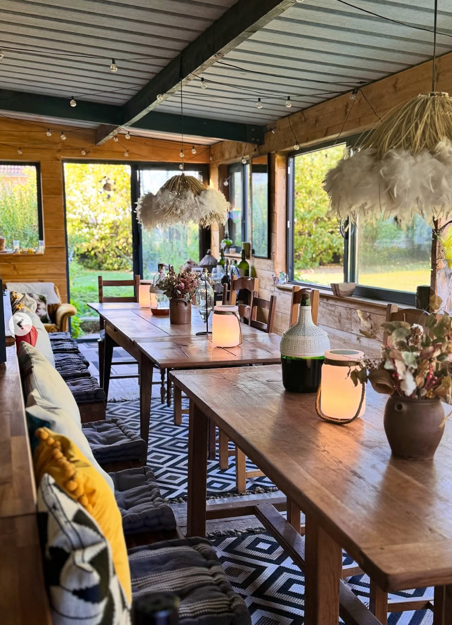 Pour vos réceptions, La Table des Lis met à votre disposition une salle spacieuse pouvant accueillir jusqu’à 33 convives assis. Elle est équipée d’une cuisine professionnelle comprenant un four, un lave-vaisselle, un barbecue, ainsi que tout le nécessaire de cuisine : casseroles, poêles, ustensiles, verres, assiettes, couverts et plats de service. Vous y trouverez également un espace de stockage frigorifique, des sanitaires, et un cadre chaleureux et convivial, idéal pour vos repas, dîners ou moments festifs