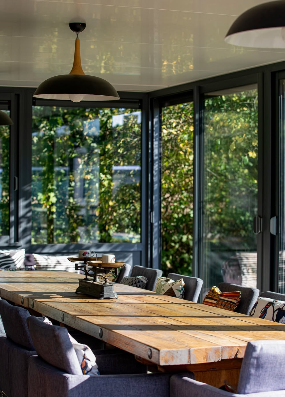 - Une salle à manger sous véranda de 14 places assises, entièrement ouvrable sur l’extérieur, avec un canapé convertible (2 places).